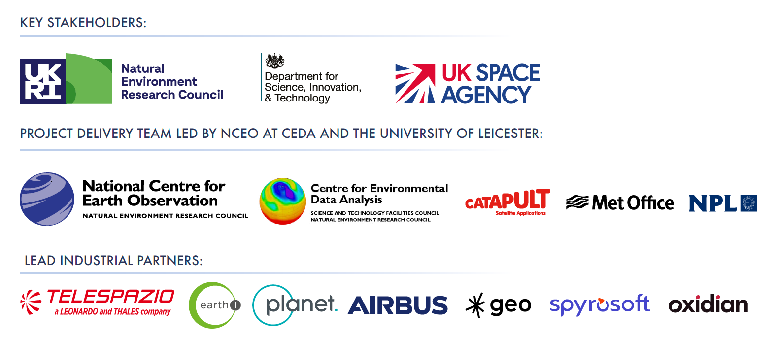 The project brings together a strong team of partners from across the public sector. Lead by National Centre for Earth Observation (NCEO), specifically with members situated within the Centre for Environmental Data Analysis (CEDA) and the University of Leicester, the EODH project team provide oversight and management of a consortium of experts from across research and the commercial sector, including National Physical Laboratory, Met Office and Satellite Applications Catapult