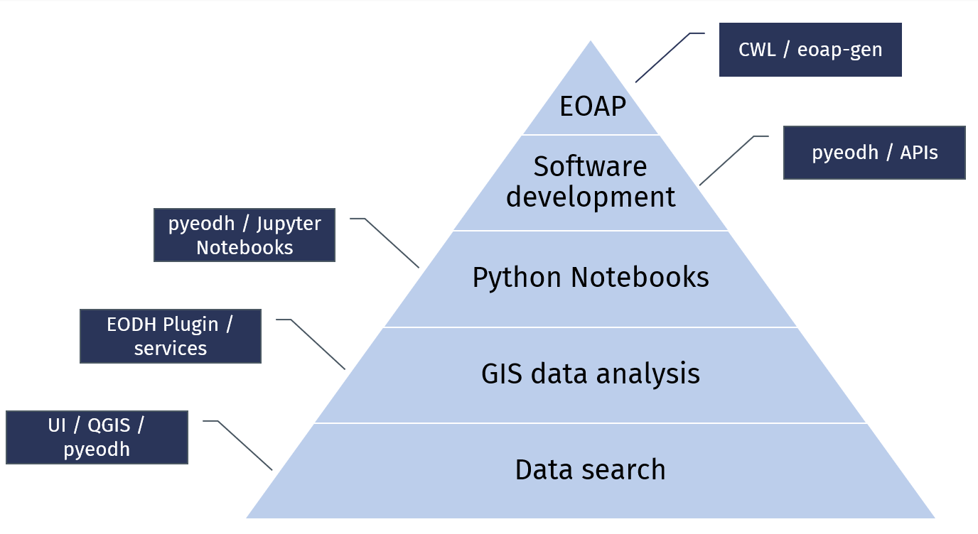 For GIS data analysis, you will be able to interact using the EODH plugin to pull data directly into QGIS, or utilise services to integrate with other GIS softwares.