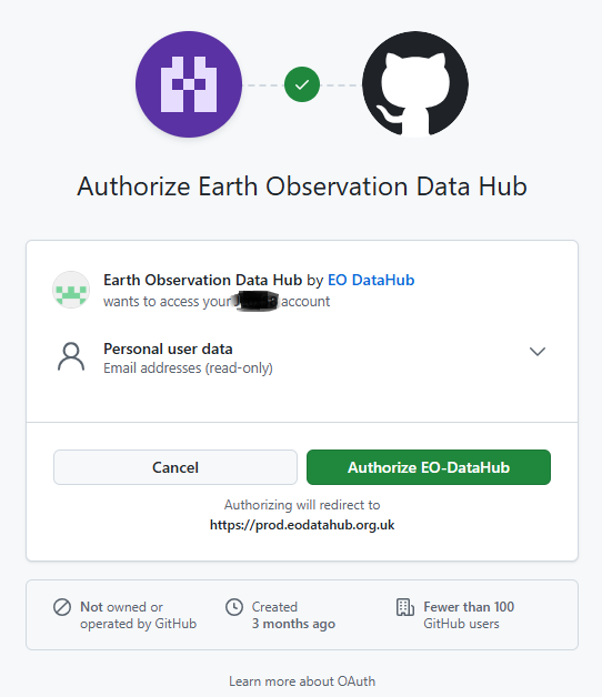 When logging into the hub for the first time via GitHub, you will be asked to authorise EO-DataHub using GitHub keycloak, so the account can be used to login.