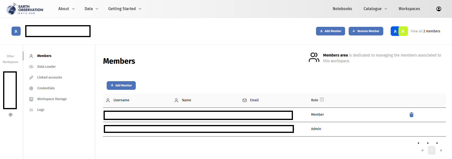 When created, the workspace should be ready to use and can be seen in the interface, as shown below. By creating the workspace, you become the Account Owner of it. You cannot remove yourself as a member of a workspace you own, but you can add users to it.