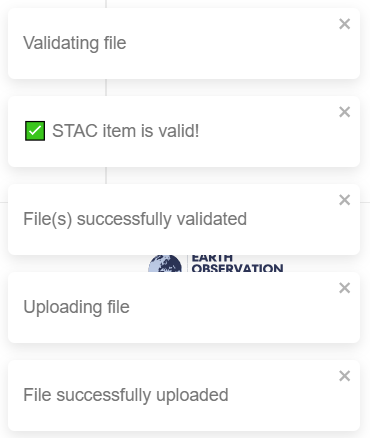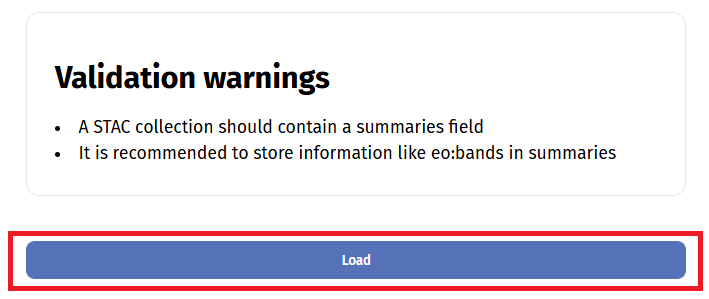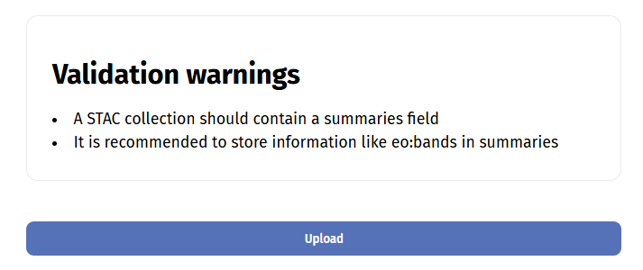 This will send your chosen Items for validation to ensure they are valid STAC JSON before you upload them to the Hub. This may also return some warnings and suggestions to improve your STAC definitions, and correct any compliance issues. For example this may suggest you update your ID field to avoid STAC indexing issues or provide some recommendations to improve the quality of your STAC metadata, such as adding recommended fields.