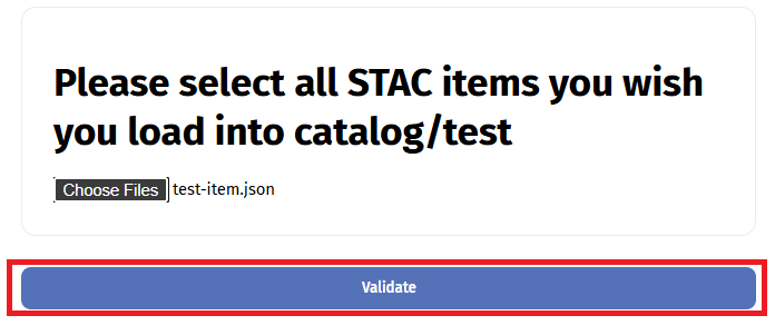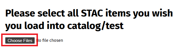 Now you are ready to upload your STAC Item metadata files. Select the Choose Files box and select any STAC Items you wish to upload to your selected Catalog and Collection.