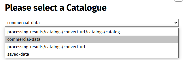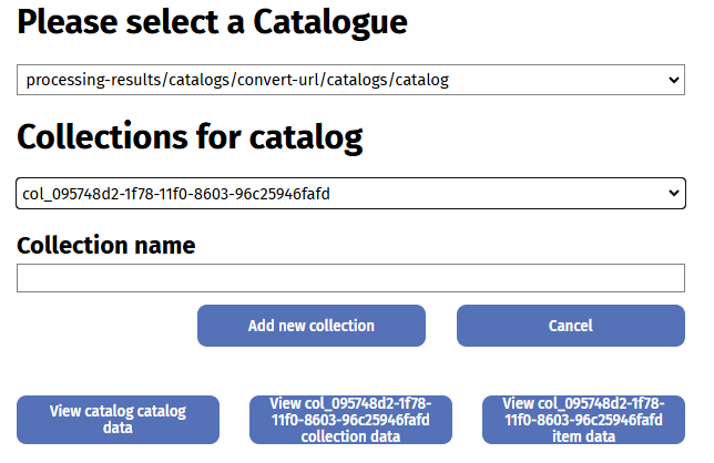 As STAC data is organised into Catalogs, Collections and Items, you must next select the Collection you wish to load any STAC Items into. Another drop-down list is provided containing any Collections within the selected Catalog, if instead you wish to load your data into a new Collection, you can specify a new Collection ID in the text box, to invoke the creation of a new template Collection.