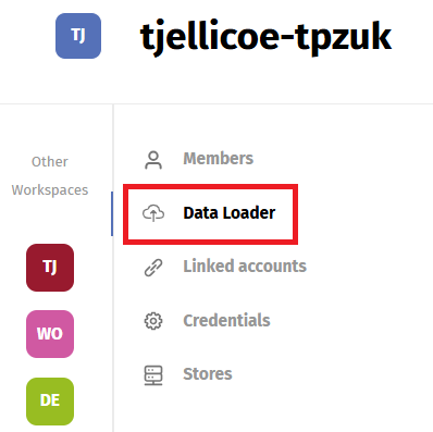 First navigate to the Workspaces page on the Hub, logging in if necessary, and select the workspace you wish to load data into from the icons on the left. Then select Data Loader from the menu on the left side of the page.