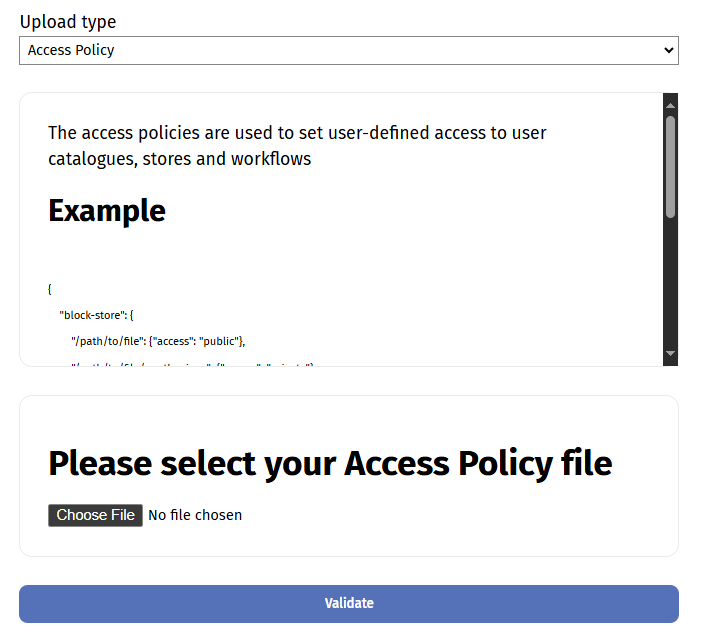 The Data Loader allows you to configure the access policies by uploading a JSON file defining paths with associated access settings, as in the below example.