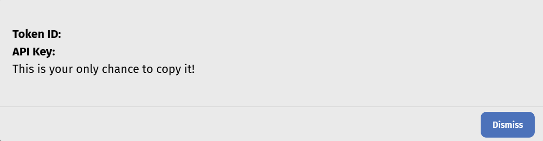 When you generate an API key from your Hub workspace, you will be given a Token ID and API key, as shown below. The API key should be used when connecting to your Hub workspace via the QGIS Plugin or Jupyter Notebooks. Always check you have copied across the correct character string when asked for your API key.