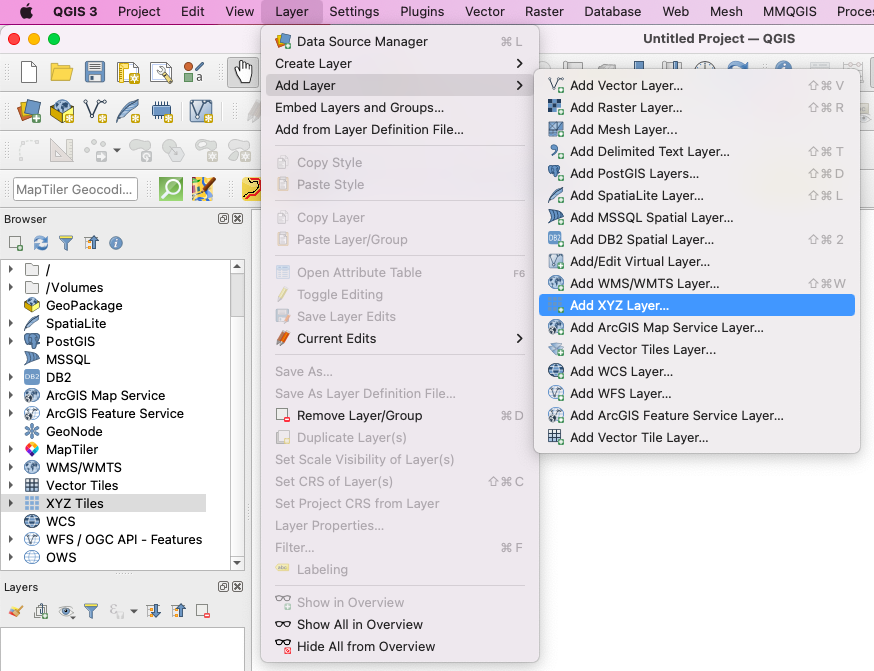 Open QGIS Desktop and on the Toolbar navigate to Layer -> Add Layer -> Add XYZ Layer
