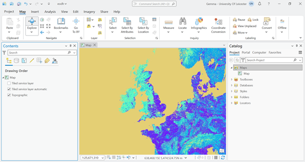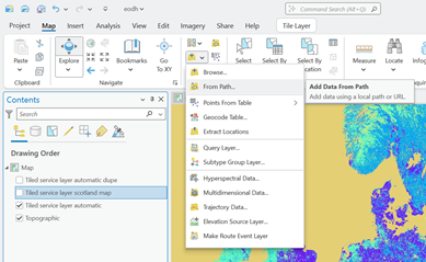 Leave the Service Type as Automatic, and click Add. You shouldn’t need to add any Custom Request Parameters. Your image should then be visualised as a layer within the Contents panel. If the data doesn’t appear on the map immediately, the image could be taking a while to render. Try Zooming in and out on the map to trigger the rendering of the data, and soon your image should be loaded into the Map pane.