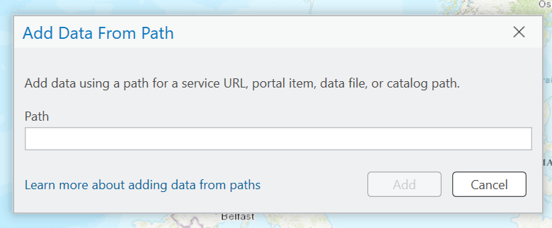 The Add Data From Path pop out will appear. Input your URL into the text box. You can use the following example link to try this out with some open land cover data.
